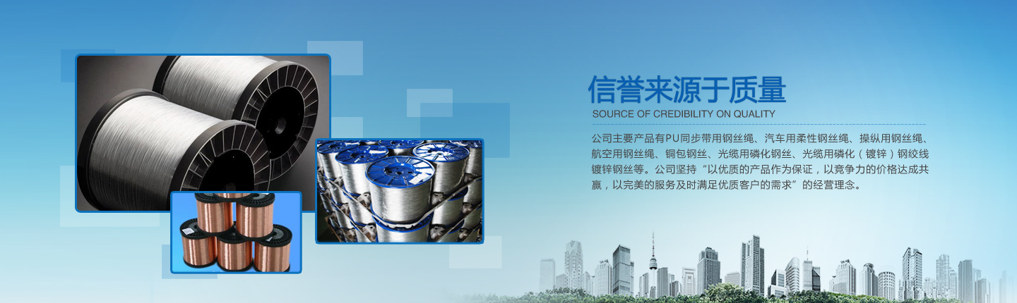 公司主要產品有PU同步帶用鋼絲繩、汽車用柔性鋼絲繩、操縱用鋼絲繩、航空用鋼絲繩、銅包鋼絲、光纜用磷化鋼絲、光纜用磷化(鍍鋅)鋼絞線、鍍鋅鋼絲等。經過多年的研究、摸索、開發(fā),公司已形成了完整的技術、工藝軟件,產品實物質量均達到國際先進水平。